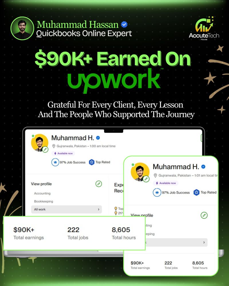 Muhammad Hassan, our QuickBooks Online Expert, has crossed $90K+ in earnings on Upwork through consistent work, client trust, and dedication to clean bookkeeping.